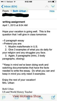 Firstly, the assignment is a middle-high school assignment, requiring students to write from the perspective of a Muslim. The ACLJ notes that while requiring students to consider Islam, the public school system is persecuting Christianity more and more. Students are discouraged from bringing Bibles to school and discouraged from praying (at least in an obvious manner). The ACLJ makes the claim that public schools are to be places of religious freedom. While this type of assignment does not infringe upon an individual’s freedom to worship his god, it does require that students pretend, for a moment, to worship the god of Islam.